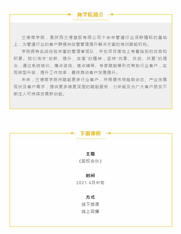 根據(jù)客戶需求,結合公司多年來積累的實踐經(jīng)驗、方法,以及目前行業(yè)客戶群體的難點痛點,蘭德商學院制定了詳細的培訓方案。